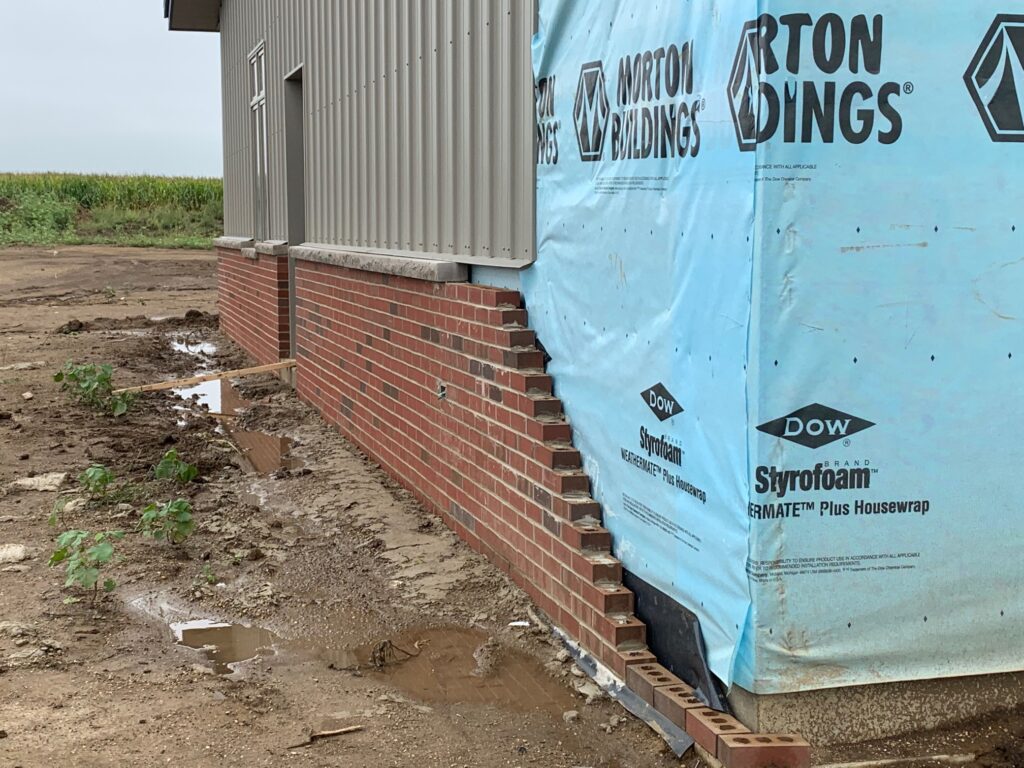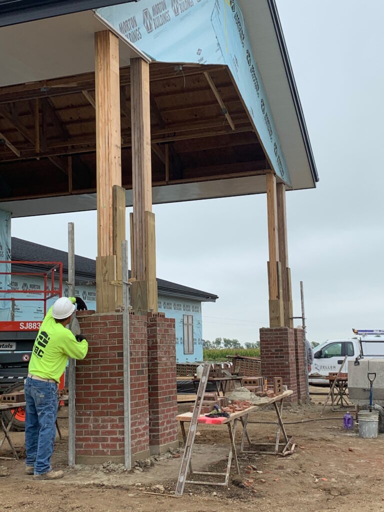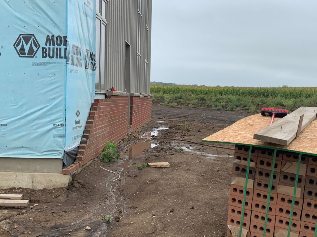 The brick on the north facing wall is finished now and you can really start to see some of the finished look of the building!This is the brick on the north facing side of the building. This side of the building has the chapel and offices inside of it and the brick is finished up the front. The bottom portions of the supporting posts for our covered entryway are going to feature some of the same brick that is on the building itself.
